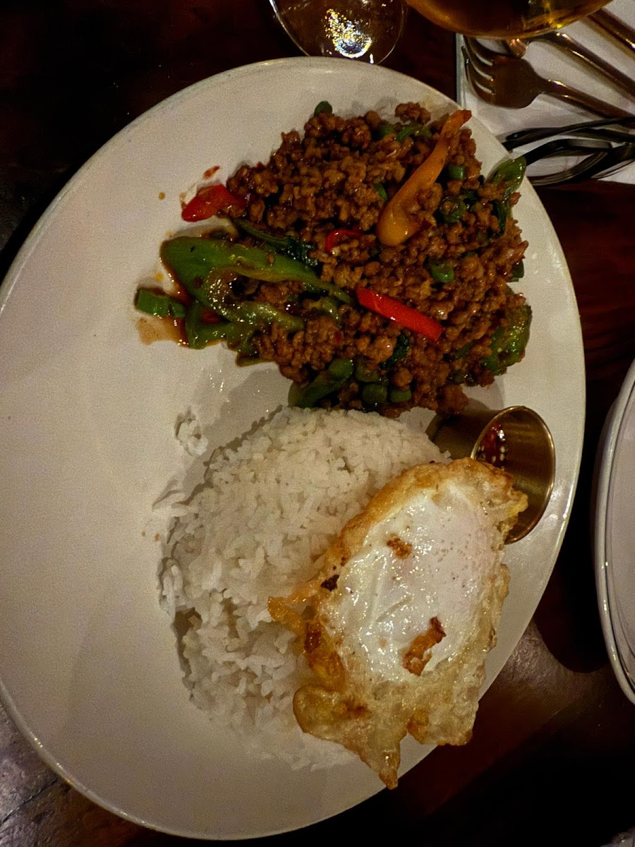 Just a block away from Time Square! Love how convenient it is located. So glad we made the reservation in advance. Nice atmosphere and the hosts were welcoming. Our table was ready when we got there. (They would only bring you to the table if everyone in your party had arrived). When we sat down, we were told that we have 1.5 hour dining time, a little pressure to decide what to order from the extensive menu, especially when there are no pictures next to the dishes names! Our server was helpful when recommending the dishes and he asked us multiple times if anyone has food allergies. We appreciated that! With the dining time limit, we decided to order a few simple traditional dishes like Pad Thai and Pineapple fried rice. The mango salad was quite tasty though the avocado on the top had brown patches. The sautéed prawns and squid was delicious, definitely everyone’s favorite. Would love to try their curry beef next time!