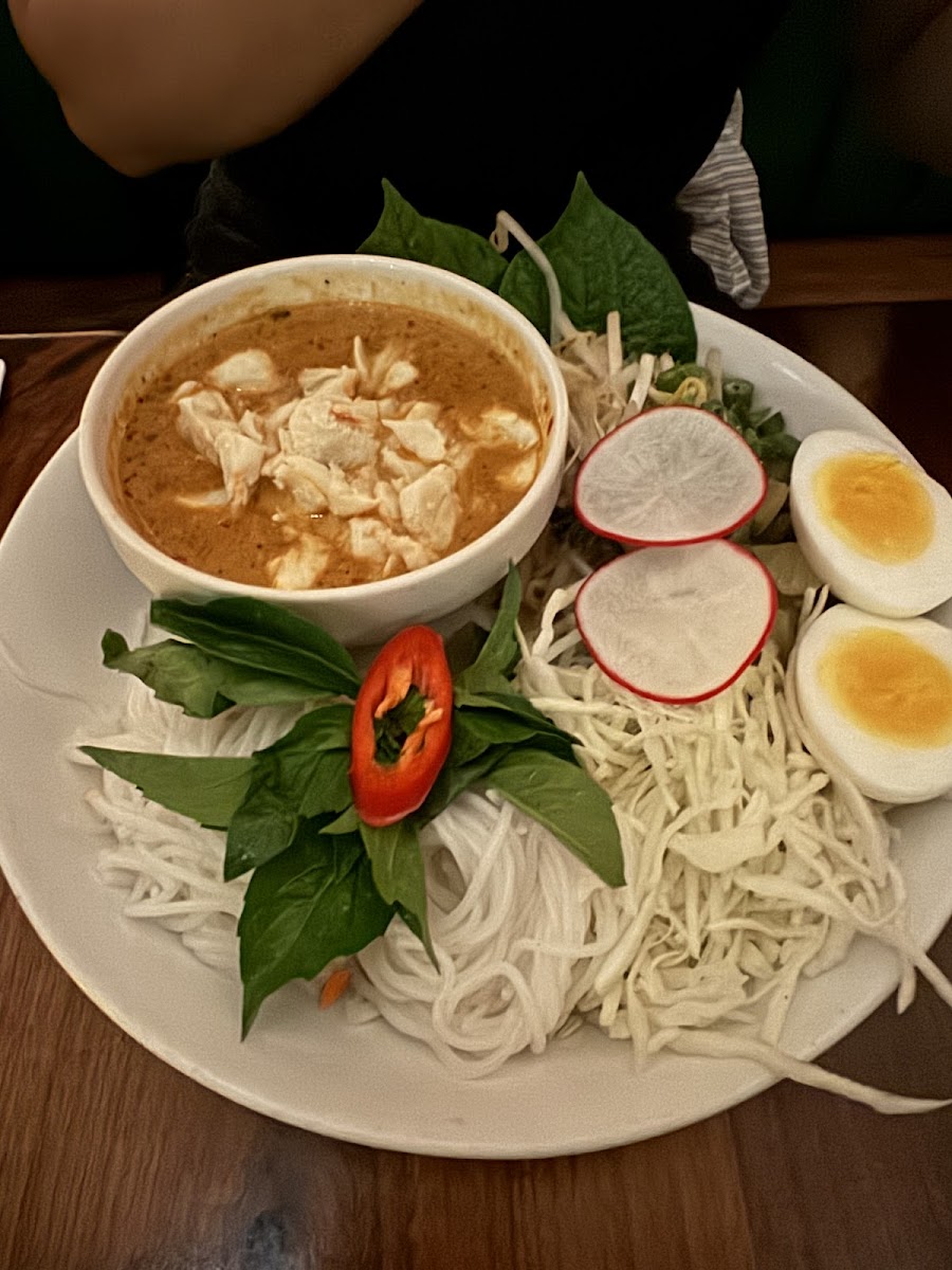 I was sat at the bar counter and served by Kan. He did an amazing job engaging with customers at the bar despite being busy on Christmas night. Made recommendations and helped me eat the authentic way The food was really good and fresh. I got the Tod Min goons which is deep fried shrimp pancakes with sweet and sour sauce and they were so good but the star of the night was the spicy crab curry with salad and rice noodles. The drinks were delicious too. I got the lychee cocktail for appetizer which was light and refreshing and the pandas drink for dinner which was creamy and good. Overall such a good experience. I would definitely come back and recommend this place highly.